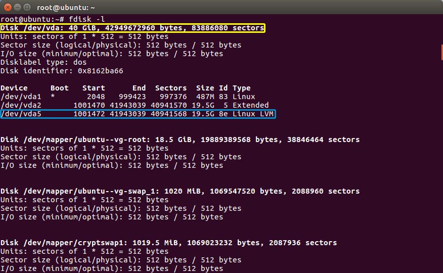 图中可以看出,当前磁盘有 40GB,而我们仅仅让LVM使用了其中的 19.5GB,我们的目标就是让LVM使用到全部的40GB,并将多余空间分配给 root 分区