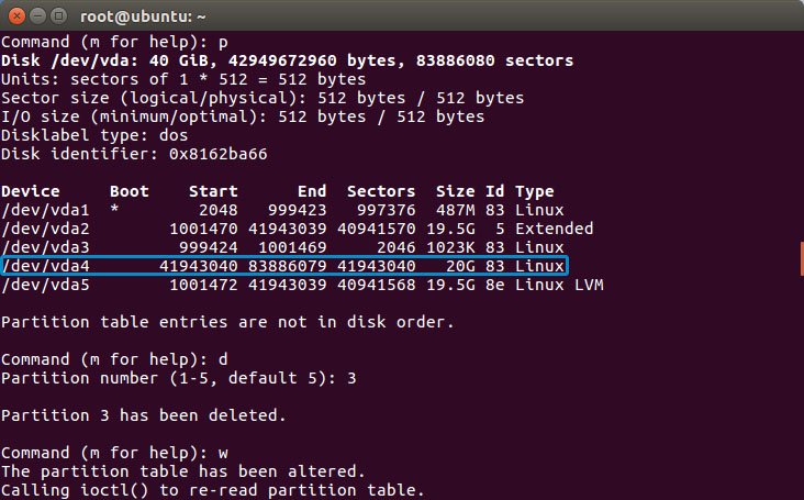 对于 fdisk 的使用,这里不在作介绍,最终效果如下图,可以看到,即将要被占用的分区被分配了 /dev/vda4 的分区标识符