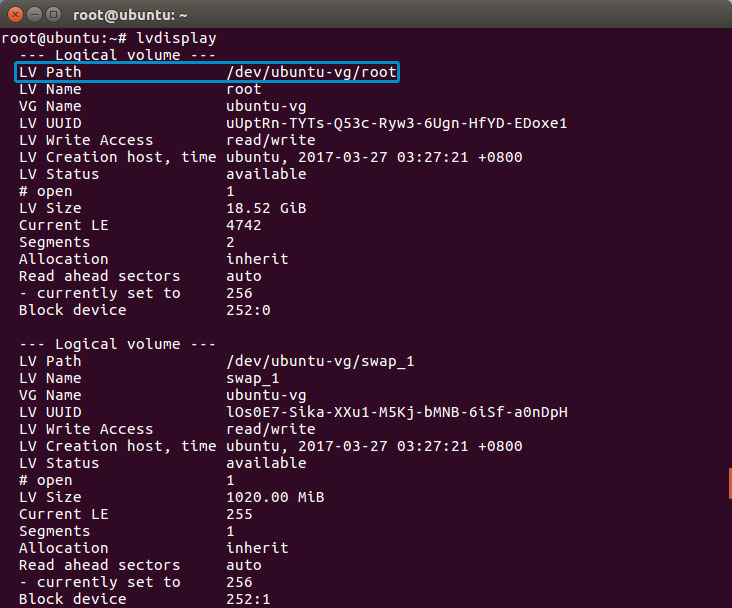 首先,我们要确认一下当前的 LV 状态,使用 lvdisplay 命令查看