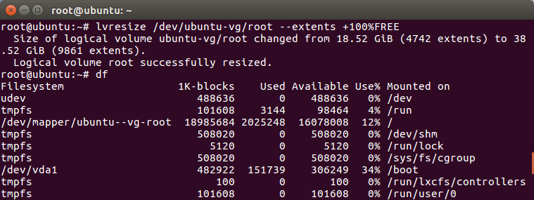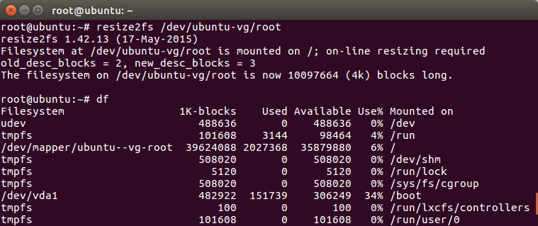 可以看到,VG 中空闲的 20GB 已经加入到了 LV 当中,但是从上图可以看出当前文件系统还未扩容,所以根分区的大小依然不变。