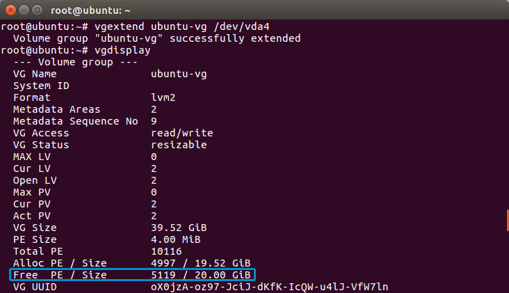 可以看到,当前的 VG 中有了 20GB 的空闲 PE 没有被分配
